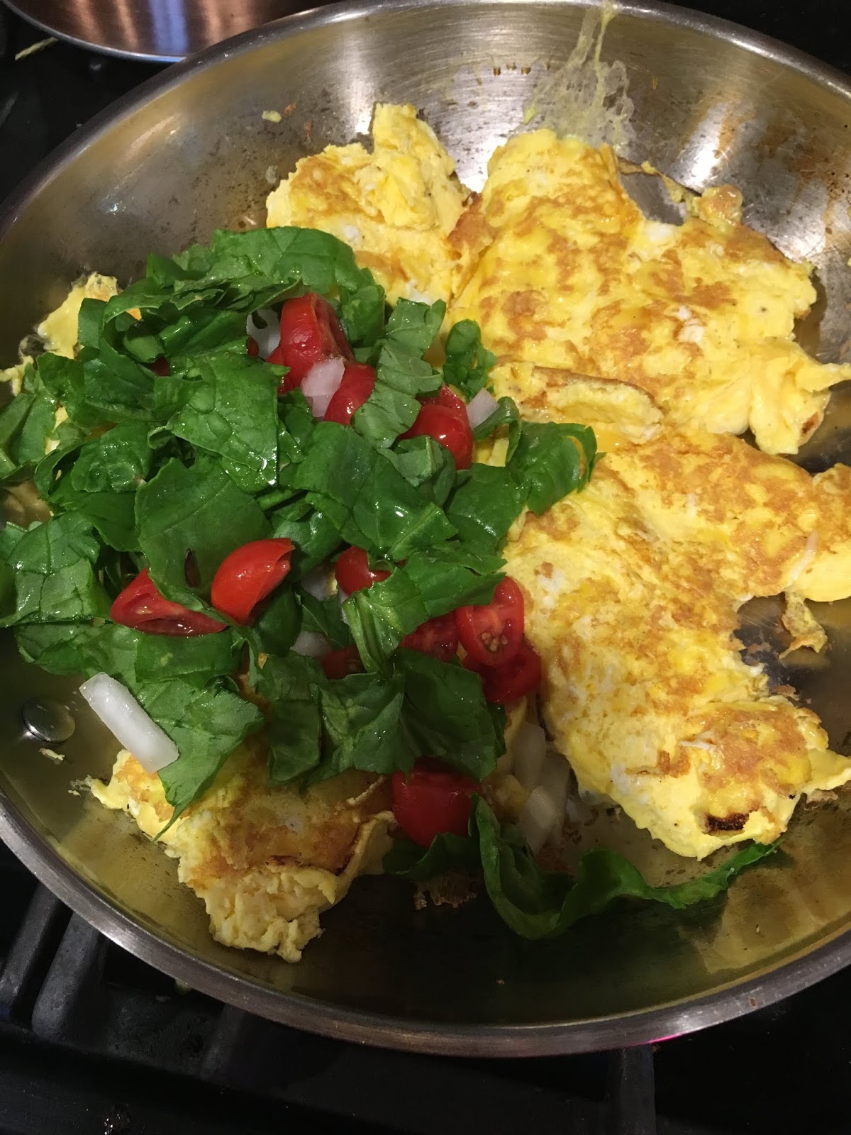 Cooked them up, topped with our spinach plus onions and tomatoes and cheese.