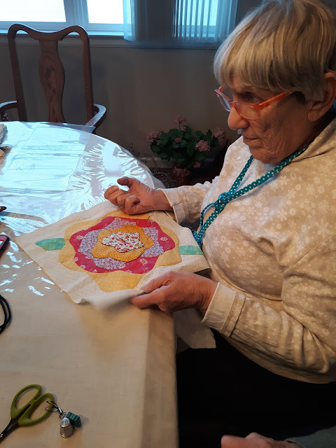 Daisy was hand appliqueing a quilt block.